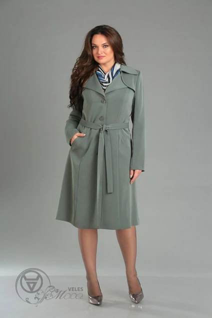 плащ на подкладке свободного силуэта с застежкой на петли и пуговицы; рукава втачные; карманы прорезные по переду; отлетные кокетки по переду и спинке; по спинке шлица; пояс съемный, длина 102, рукав 62.