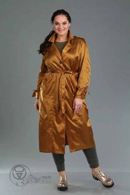 Легкий весенний плащ без подкладки прямого силуэта, рукава реглан, застежка по переду на петли и пуговицы, по переду прорезные карманы с листочками, по спинке шлица, пояс и завязки на рукавах съемные