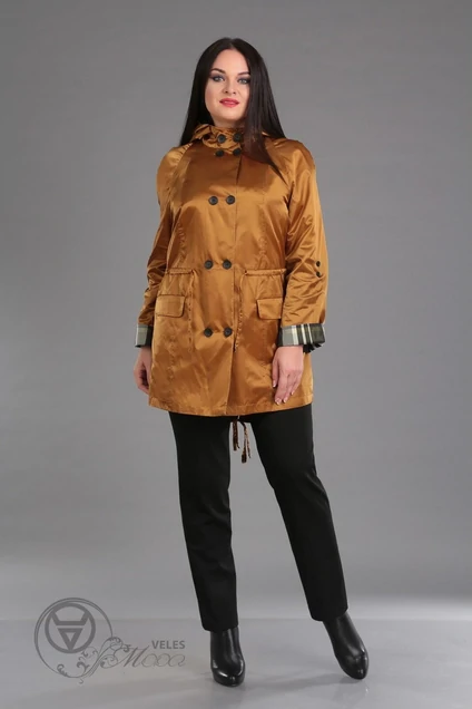 плащ-парка прямого силуэта на подкладке с двубортной застежкой на петли и пуговицы, с капюшоном; рукав реглан с отворотами, по линии талии кулиска, прорезные карманы по переду.