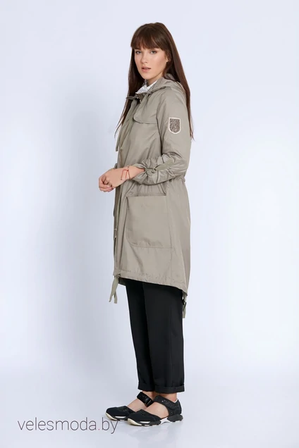 Современный молодежный легкий плащ ( парка ) без подкладки с капюшоном, с разной длинной полочки и спинки, с застежкой на металлическую молнию, с накладными карманами с клапанами и кулисой по талии. Спинка со средним швом и разрезом в нижней части. Изделие декорировано тесьмой в тон полотна и металлической фурнитурой. длина изделия 97см, рукав 62 см, 52 и 54рр 99см