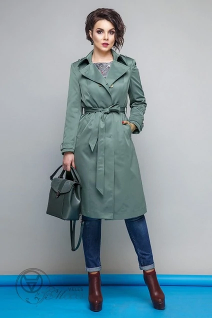 Плащ полуприлегающего силуэта, на подкладке, длиной чуть ниже середины колена, с втачными рукавами. Плащ с поясом. Двубортная застежка на пуговицах на уровне талии переходит в однобортную. Спинка с центральным швом и шлицей, рельефами, выходящими из плеч. Перед с рельефами, выходящими из плеч, погонами на плечах со шлевками и пуговицами. По переду обработаны прорезные карманы с листочками с настрочными концами. Плащ со стояче-отложным воротником (стойка воротника отрезная). Двухшовный рукав плаща декорирован патой, продетой в шлевку, край паты закреплен пришитой пуговицей. Все швы отстрочены декоративной строчкой. Шлевки для пояса пришиты в боковых швах. Длина по спинке - 106,0 см Длина рукава - 63,0 см