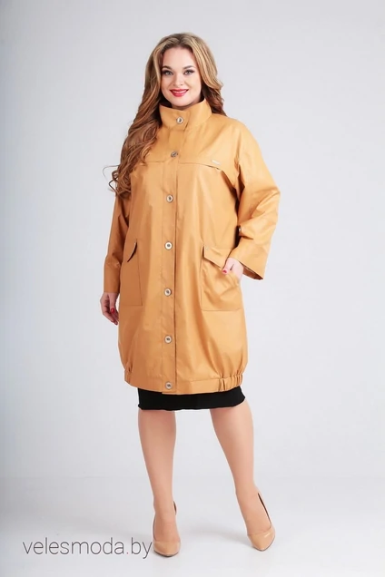 Плащ женский, на подкладке, свободного силуэта, со спущенной линией плеча, укороченным рукавом и притачной манжетой по низу. По низу плаща планка с резинками по боковым швам. По переду фигурные накладные карманы с клапаном. Центральная застежка на отрезной планке на петли и пуговицы. Воротник - стойка.