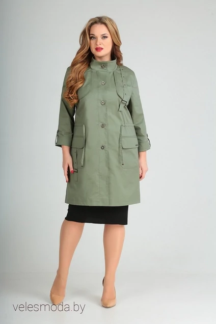 Плащ женский свободного силуэта, на подкладке, с центральной застежкой на петли и пуговицы на отрезной планке. Воротник - стойка. По переду накладные карманы с клапаном, отлетные кокетки. По кокетке и карману - планки с холитенами и декоративными пряжками. Рукав втачной с отворотом по низу и патой. По талии кулиска.