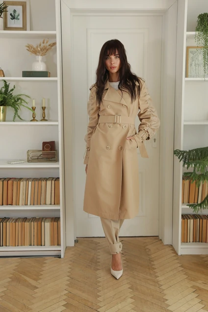 Рукав втачной, двухшовный, с декоративной присобранной деталью из отделочной ткани. По низу рукава пата, по плечу пата-погон, застёгивающаяся на пуговицу.