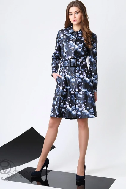 Плащ выполнен из ткани под кожу с эффектным принтом. Плащ полностью на подкладке, с карманами. Застежка на пришивные кнопки-пуговицы. Съемный пояс входит в комплект. Длина плаща сзади по спинке 101 см. длина рукава 64 см
