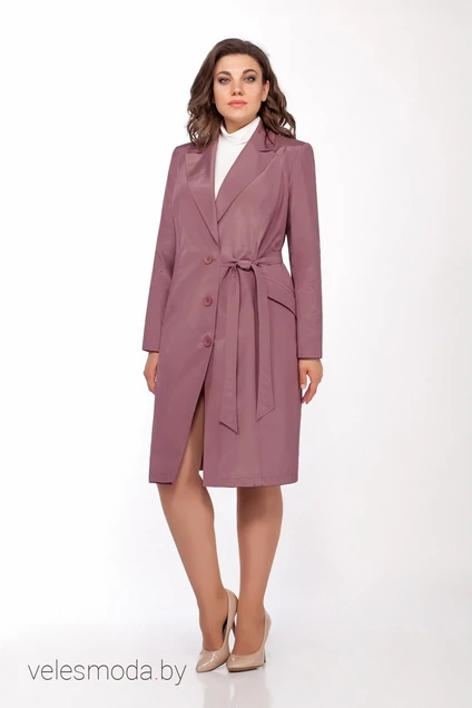 Плащ женский средней длины, полуприлегающего силуэта ,с модной смещенной застежкой на 3 пуговицы, одна деталь пояса вставлена в край полочки ,вторая в боковой шов, пояс завязывается сбоку на узел. Впереди кокетка и вертикальные рельефы, на боковых деталях внутренние карманы в рамочку и клапанами, отложной воротник и лацканы. По спинке кокетка и вертикальные рельефы, центральный шов со шлицей. Рукав длинный, внизу шлица и 5 пуговиц. Плащ полностью на подкладке. Длина плаща сзади по спинке от плечевого шва 103 см, длина рукава плаща 62см.