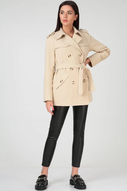 Плащ женский укороченный, полуприлегающего силуэта на подкладке. По переду функциональные прорезные карманы с клапаном, отлетные кокетки по переду и спинке. Рукав реглан длинный-имеет возможность подворота. По спинке шлица-разрез. Воротник стояче-отложной с отрезной стойкой, застежка двубортная на петли и пуговицы. По талии съемный пояс из основной ткани.