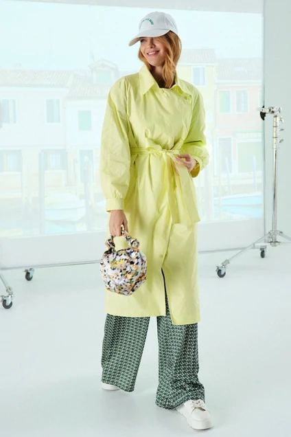 Тренч женский, прямого силуэта. Длинной миди. Застежка- центральная, на кнопки. Линия талии фиксируется съемным поясом. Рукав-реглан. Воротник- отложной. Рукав динный, внизу на манжете с резинкой. Тренч на подкладке.