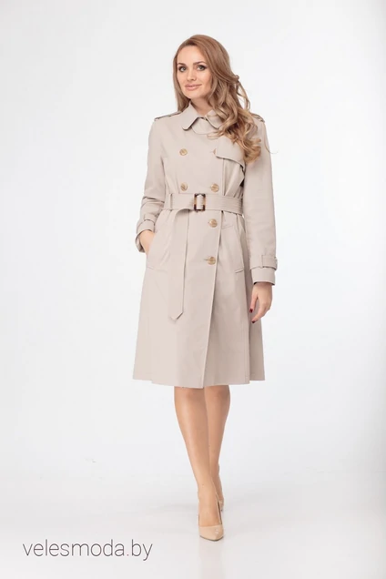 Классический тренчкот полуприлегающего силуэта. Застежка двубортная на пришивные пуговицы. Передняя полочкака с нагрудными вытачками и рельефами от линии проймы до линии низа. На левой полочке кокетка с декоративной петлей с глазком. Спинка со средним швом с открытой шлицей по низу, боковыми рельефами и кокеткой. Рукав длинный втачной двухшовный. По низу рукавов – шлевки для пат. По плечевым швам – пагоны. Воротник отложной с притачной стойкой. По линии талии плащ регулируется съемным поясом на пряжке. Изделие выполнено на подкладке, без утеплителя. Длина от плечевого шва 103 см. Длина рукава 61см.