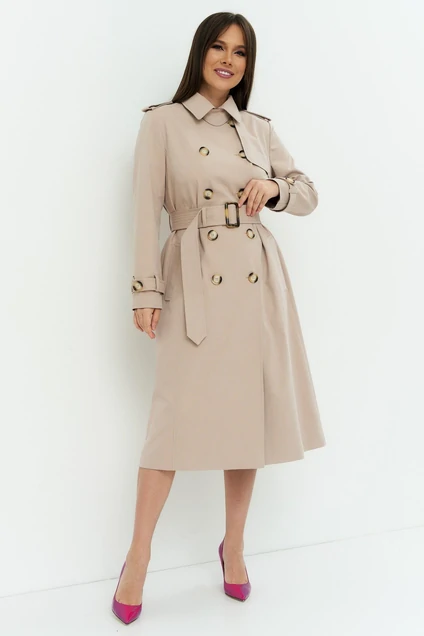 Классический плащ (тренчкот) свободного силуэта. Застежка двубортная на пришивные пуговицы (пуговицы могут отличаться от фото!). Передняя полочка с нагрудными вытачками и рельефами от линии проймы до линии низа. На левой полочке кокетка с декоративной петлей с глазком. Спинка со средним швом, боковыми рельефами и кокеткой. Рукав длинный втачной двухшовный. По низу рукавов – шлевки для пат. По плечевым швам – погоны. Воротник отложной с притачной стойкой. По линии талии плащ регулируется съемным поясом на пряжке. Изделие выполнено на подкладке, без утеплителя.  Длина от плечевого шва 113 см. Длина рукава 61 см
