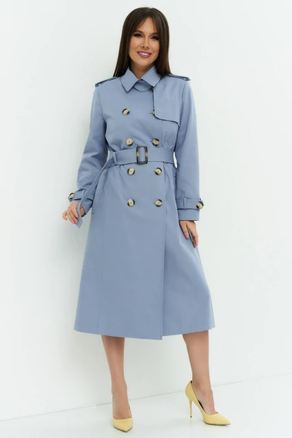 Классический плащ (тренчкот) свободного силуэта. Застежка двубортная на пришивные пуговицы (пуговицы могут отличаться от фото!). Передняя полочка с нагрудными вытачками и рельефами от линии проймы до линии низа. На левой полочке кокетка с декоративной петлей с глазком. Спинка со средним швом, боковыми рельефами и кокеткой. Рукав длинный втачной двухшовный. По низу рукавов – шлевки для пат. По плечевым швам – погоны. Воротник отложной с притачной стойкой. По линии талии плащ регулируется съемным поясом на пряжке. Изделие выполнено на подкладке, без утеплителя. Длина от плечевого шва 113 см. Длина рукава 61 см