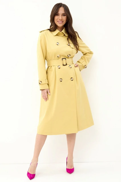 Классический плащ (тренчкот) свободного силуэта. Застежка двубортная на пришивные пуговицы (пуговицы могут отличаться от фото!). Передняя полочка с нагрудными вытачками и рельефами от линии проймы до линии низа. На левой полочке кокетка с декоративной петлей с глазком. Спинка со средним швом, боковыми рельефами и кокеткой. Рукав длинный втачной двухшовный. По низу рукавов – шлевки для пат. По плечевым швам – погоны. Воротник отложной с притачной стойкой. По линии талии плащ регулируется съемным поясом на пряжке. Изделие выполнено на подкладке, без утеплителя. Длина от плечевого шва 113 см. Длина рукава 61 см