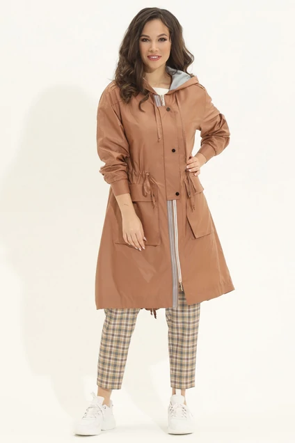 Стильная парка в стиле Casual свободного силуэта, на подкладке. Выполнена из плащевой ткани. Фигурная линия плеча, плечо спущенное, длинный рукав с притачной манжетой из трикотажа. Асимметричный низ изделия. Парка с накладными карманами. Застегивается на декоративную молнию, а затем закрывается притачной планкой и застегивается на отделочные кнопки. Плащ дополнен капюшоном. По талии-потайная кулиса. По спинке внизу затягивается на отделочную тесьму. Изделие декорировано отделочной тесьмой.