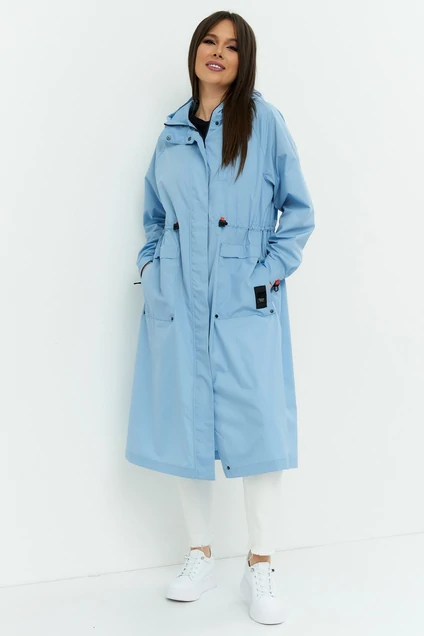 Стильный комплект из плаща и утепленного жилета. Плащ свободного кроя с центральной застежкой на двухзамковую молнию и металлические кнопки. Рукав спущен. По талии кулиска с эластичной тесьмой с регуляцией. Плащ без подкладки, дополнен карманами. Можно носить отдельно или утеплиться с помощью жилета. Жилет прямого кроя, утеплен, с центральной застежкой на молнию. Дополнен боковыми карманами. Крепится к плащу на петлю и кнопку. Длина плаща от плечевого шва 113см. Длина рукава 60см. Длина жилета от плечевого шва 59см.