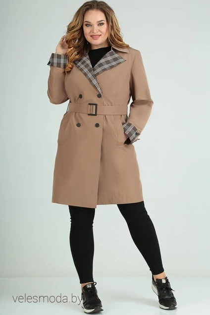 Плащ женский прямого силуэта из плащевой ткани со съёмным поясом на декоративную отделочную пряжку, на подкладке. Перед плаща с боковыми рельефными и нагрудной вытачкой. В боковом рельефном шве обработаны карманы с широкой листочкой. Застёжка двубортная на 2 пары отделочных пуговиц. Спинка плаща с кокеткой, средним швом и боковыми рельефными швами. Воротник втачной на высокой притачной стойке с широкими отложными лацканами из отделочной ткани. Рукав втачной двухшовный. Низ рукава обработан манжетой из отделочной ткани. Углы манжеты закреплены отделочными пуговицами. Воротник, боковые рельефные, средний шов спинки, шов кокетки, локтевой шов, съёмный пояс, отстрочен двойной отделочной строчкой.