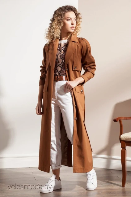 Хлопковый тренч прямого силуэта с покроем рукава реглан с отлетными кокетками, пристегивающимися на пуговицы и большими накладными карманами с клапанами на переде. Застежка центральная однобортная на 5 пуговиц в натуральном стиле. Воротник пиджачного типа с отложными цельнокроеными лацканами. Рукава длинные с патами по плечам низу рукавов, застегивающиеся на пуговицы. Спинка со средним швом с открытой шлицей по низу. Дополнением является съемный пояс из основной ткани. Тренч на поливискозной подкладке.