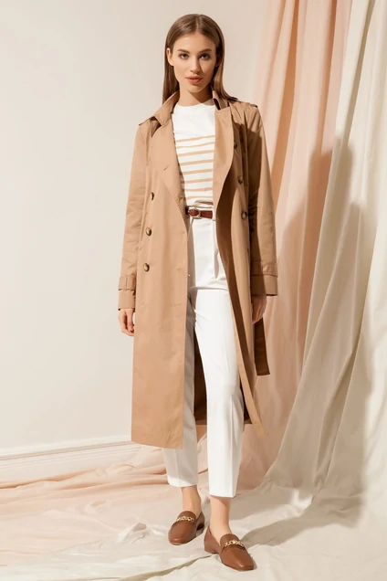 Классический тренч из плащевой хлопковой ткани двубортный с застежкой на петли и пуговицы в натуральном стиле, с втачным покроем рукава с патами по низу. Воротник отложной, по плечам погоны с пуговицами. Перед с рельефами идущими от плеча до низа изделия, прорезными карманами с листочками. Спинка с боковыми рельефами, средним швом, заканчивающимся шлицей и отлетной кокеткой, застегивающуюся на пуговицу. Талия акцентируется съемным поясом. Изделие на отлетной подкладке по низу.