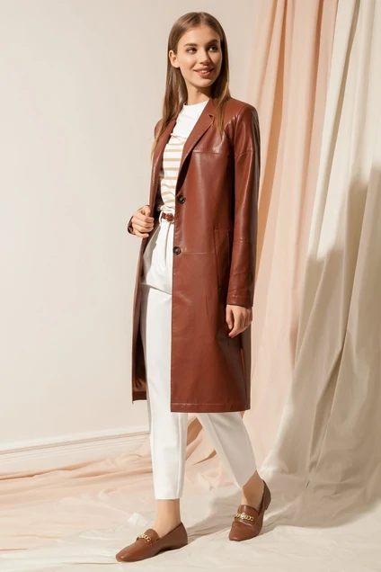 Стильный плащ из экокожи прямого силуэта с центральной бортовой застежкой на пуговицы. Воротник пиджачного типа с отложными лацканами. Перед, спинка и рукава с горизонтальными подрезами с отделочными строчками. Перед с прорезными широкими карманами-листочками. Изделие на вискозной подкладке.