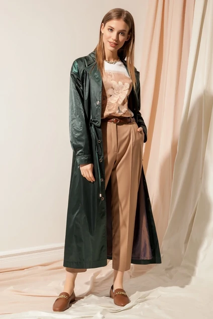 Стильный плащ из легкой плащевой ткани прямого свободного силуэта со спущенной линией плеча, отрезной выше линии талии и кулисой по талии, регулируемой завязками. На переде обработаны карманы с листочками и карманы с металлическими молниями. Застежка на металлические золотые кнопки, воротник.