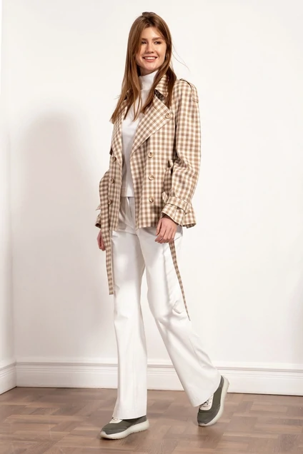 Стильный тренч из поливискозной костюмной ткани в клетку укороченный, прямого силуэта с покроем рукава реглан с отлетной кокеткой на переде и наклонными карманами с листочками . Застежка двубортная на пуговицы. Воротник на стойке с отложными цельнокроеными лацканами. Рукава длинные со съемными патами, застегивающиеся на пуговицы. Спинка со средним швом и отлетной кокеткой со встречной складкой. Дополнением является съемный пояс из основной ткани. Тренч на поливискозной подкладке.