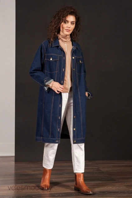 Джинсовая куртка длиной ниже колена прямого силуэта, застёгивающаяся на джинсовые пуговицы по притачной плагнке спереди. Горловина обработана воротником. Рукава втачные с притачной манжетой по низу, застёгивающиеся на одну петлю и пуговицу. Спереди декора