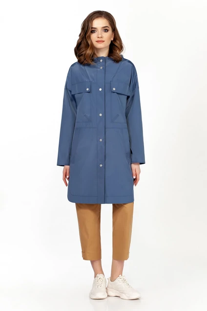 Плащ женский прямого силуэта, на подкладке с центральной сквозной застежкой на 6 кнопок, с втачным капюшоном. Детали переда с притачными планками, с кокетками, ко шву соединения настрочены клапаны с застежкой на 1 кнопку. Центральные детали с фигурным подрезом, на нижних деталях – карманы с листочками с втачными концами. Деталь спинки с кокеткой, центральная часть со средним швом. Рукава втачные одношовные. Капюшон втачной, по центру вставка, внизу прикреплена «пата» с застежкой на 2 полукольца. В боковых швах обработаны разрезы, углы разрезов округлой формы.