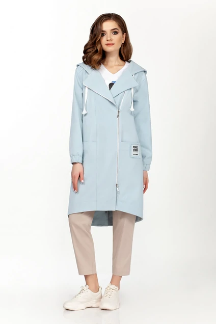 Парка женская, прямого силуэта, длиной выше коленей, с втачными рукавами, с центральной сквозной застежкой на металлическую тесьму-молнию, с втачным капюшоном. Детали переда с кокетками, с рельефными швами, на боковых частях обработаны карманы. Деталь спинки с кокеткой, со средним швом, который заканчивается шлицей с застежкой на 2 кнопки. Рукава втачные одношовные, с притачными манжетами, в которые вставлена эластичная тесьма. Низ куртки фигурной формы. Куртка с втачным капюшоном, по краю проложена отделочная строчка для протяжки шнура.