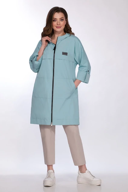 Плащ женский, прямого силуэта, на подкладке, с цельнокроеными рукавами, с центральной сквозной застежкой на металлическую тесьму-молнию, с втачным капюшоном. Детали переда с 3-мя подрезами: верхний подрез на уровне линии груди фигурной формы, на нижних деталях обработаны карманы с листочкой с втачными концами. Деталь спинки с 3-мя подрезами: верхний подрез - фигурной формы, нижняя деталь - с разрезом. Рукава цельнокроеные, с притачной «патой», которая застегивается на 1 петлю и пуговицу. Плащ: длина рукава – 65см, длина спинки – 91см.