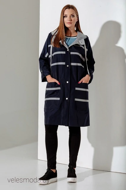 Плащ женский, прямого силуэта, на подкладке, длиной выше коленей, со спущенными втачными рукавами, с центральной сквозной застежкой на 6 кнопок, с втачным капюшоном, в боковых швах обработаны шлицы с застежкой на 2 кнопки. Детали переда с притачными планками, с 2-мя накладными карманами, с 3-мя подрезами и вставками. Деталь спинки со средним швом. Рукава втачные одношовные с горизонтальными подрезами. Плащ с втачным капюшоном, по краю проложена отделочная строчка для протяжки шнура. Плащ: длина рукава – 74см, ширина рукава - 26см, длина спинки – 100см.