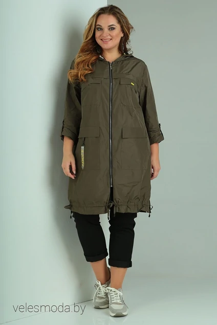 Плащ женский, без подкладки. Модель прямого силуэта с кулисой по низу и капюшоном с хлопковой подкладкой. Изделие выполнено из тонкой плащевой ткани с отделкой из принтованного штапеля. По переду застежка-молния с металлическими звеньями и двумя бегунками для удобства. В верхней части переда расположена отрезная кокетка и декоративные клапаны, с пришивной фурнитурой. Карманы накладные, также дополнены клапанами из основной ткани. На одном из карманов-стильная подвеска с неоновым принтом. Рукава втачные, длинные. Дополнены хлястиками на пуговицах, что позволяет носить рукава как с отворотом, так и без. По спинке отрезная кокетка. От линии притачивания кокетки по спинке и до линии талии, расположен декоративный отлетной элемент с люверсами и шнурками из основной ткани. Внутренние швы плаща обработаны ярким, принтованным штапелем, что придает определенный лоск и неповторимость модели.