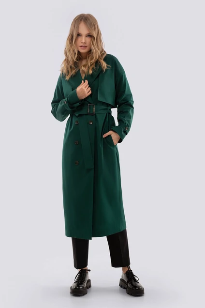 Хлопковый тренчкот свободного покроя. Детали: прямой силуэт, спущенная линия плеча, пиджачный воротник, отлетные кокетки, двубортная застежка на петли и пуговицы, рукава длинные с патами, карманы в боковых швах, съемный пояс, тренч на подкладке
