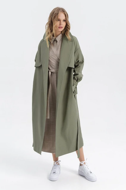 Тренчкот свободного покроя. Детали: прямой силуэт, спущенная линия плеча, пиджачный воротник, отлетные кокетки, рукава длинные с патами, карманы в боковых швах, съемный пояс, тренч на подкладке, без застежки