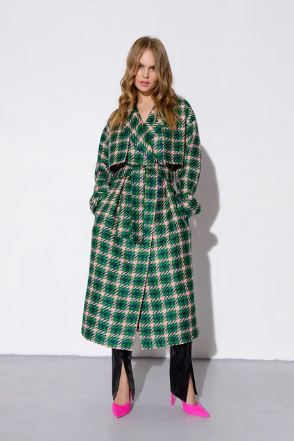 Тренчкот свободного покроя из текстильной ткани в клетку. Детали: прямой силуэт, спущенная линия плеча, пиджачный воротник, отлетные кокетки, двубортная застежка на пришивные кнопки, рукава длинные, карманы в боковых швах, съемный пояс, тренч на подкладке