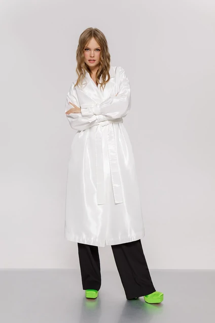 Тренчкот свободного покроя. Детали: прямой силуэт, спущенная линия плеча, пиджачный воротник, отлетные кокетки, двубортная застежка на пришивные кнопки, рукава длинные, карманы в боковых швах, съемный пояс, тренч на подкладке
