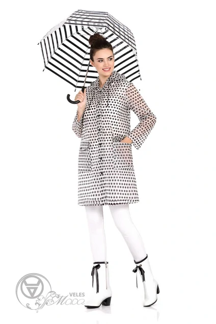 Практичный плащ-дождевик с капюшоном из водонепроницаемого принтованного материала. Детали: трапециевидный силуэт с кокетками и большими накладными карманами с клапанами, спущенная линия плеча, рукава длинные втачные, застежка на кнопки Длина по спинке: 42-46=88 см, 48-54=90 см Длина рукава: 42-54=59 см