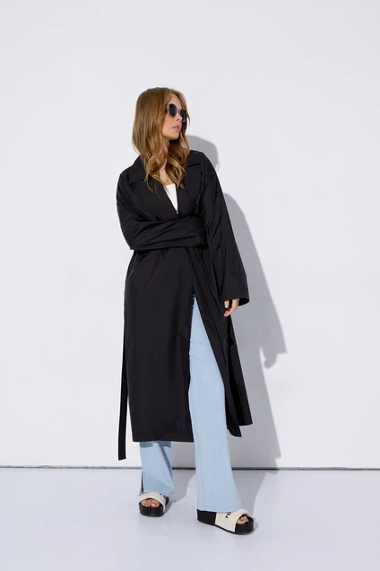 Универсальный легкий двубортный плащ-пыльник свободного покроя с большими отлетными кокетками. Детали: прямой силуэт, спущенная линия плеча, пиджачный воротник, без застежки, рукава длинные с декоративными завязками по низу рукавов, карманы в боковых швах, шлевки и съемный пояс, плащ на подкладке Дл. по спинке около 115см; дл. рукава+ плечо около 53+9=62см