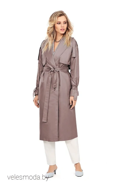 Универсальный плащ-пыльник свободного покроя с большими отлетными кокетками. Детали: прямой силуэт, спущенная линия плеча, пиджачный воротник, без застежки, рукава длинные с декоративными завязками, карманы в боковых швах, шлевки и съемный пояс, на подкладке, металлическая фурнитура