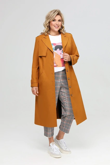 По переду тренча есть вертикальные рельефные швы, в которых располагаются карманы с наклонной линией входа с листочками. Застежка центральная бортовая на петли и пуговицы. Воротник пиджачного типа с лацканами. По переду с левой стороны есть отлетная кокетка, аналогичная кокетка есть на спинке. Также по спинке есть застежка с планкой на петли и пуговицы (функциональная, но несет больше декоративную нагрузку). По низу рукавов есть паты, а на плечевых швах располагаются погоны со шлевками. С тренчкотом прилагается съемный пояс с протяжкой круглой формы. Изделие на подкладке.