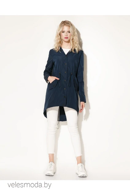 Плащ- парка, длинной выше колена с перепадом длины Застежка по переду на кнопки, по талии вставлена резинка с кулисой Карман прорезной с клапаном. По спинке средний шов заканчивающийся разрезом, по низу кулиса на резинке Рукав втачной длинный, имеется удобный капюшон.