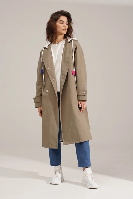 Плащ прямого силуэта, двубортный на подкладке с застежкой на кнопки. Капюшон съемный из трикотажного полотна, со шнуром и декоративными элементами. Воротник пиджачного типа с лацканами.По переду справа отлетная кокетка. Рукав реглан, длинный с декоративной горизонтальной патой и застежкой на кнопку. По спинке отлетная кокетка контрастного цвета. В комплекте имеется съемный пояс. длина по спинке- 106 см, рукав- 74 см