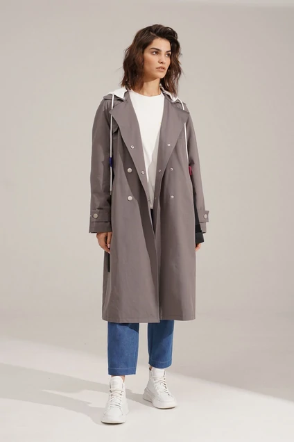 Плащ прямого силуэта, двубортный на подкладке с застежкой на кнопки. Капюшон съемный из трикотажного полотна, со шнуром и декоративными элементами. Воротник пиджачного типа с лацканами. По переду справа отлетная кокетка. Рукав реглан, длинный с декоративной горизонтальной патой и застежкой на кнопку. По спинке отлетная кокетка контрастного цвета. В комплекте имеется съемный пояс. длина по спинке- 106 см, рукав- 74 см