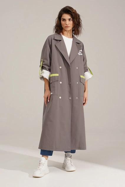 Плащ прямого силуэта, двубортный на подкладке с застежкой на кнопки. Воротник пиджачного типа с лацканами.Рукав со спущенной линией плеча, длинный с декоративной патой на кнопке. По переду накладные карманы с клапанами. Спинка с кокеткой, от кокетки до низа вертикальная шлица на кнопках. Клапаны кармана, паты на рукавах и шлица на спинке из контрастной ткани. На груди и на кармане декоративня печать. длина по спинке- 125 см, рукав- 73 см