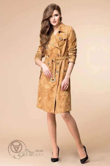 Плащ женский предназначен для повседневной носки, полуприлегающего силуэта, слегка расширен книзу, длиной до середины колена. Перед с двумя нагрудными вытачками, с двумя притачными бочками, с двумя карманами, обработанными в швах соединения бочков и переда с фигурными клапанами, которые крепятся к переду на 1 обметанную петлю и 1 пуговицу. Спинка с двумя рельефами, выходящими из плечевых швов, и средним швом, заканчивающимся шлицей. Спинка с отлетной кокеткой, пристегивающуюся на 1 обметанную петлю и 1 пуговицу к спинке. Горловина круглая с воротником с закругленными концами с отрезной стойкой. Застежка двубортная, застегивающаяся на 12 обметанных петель и 12 пуговиц. Рукав длинный, двух шовный, с патой, пристегивающейся к рукаву на 1 обметанную петлю и 1 пуговицу. Плащ со съемным поясом, который крепится 5 шлевками к изделию. Плащ на притачной подкладке по низу. Изделие с плечевыми накладками. Длина спинки 100 см. Длина рукава 61.5 см.