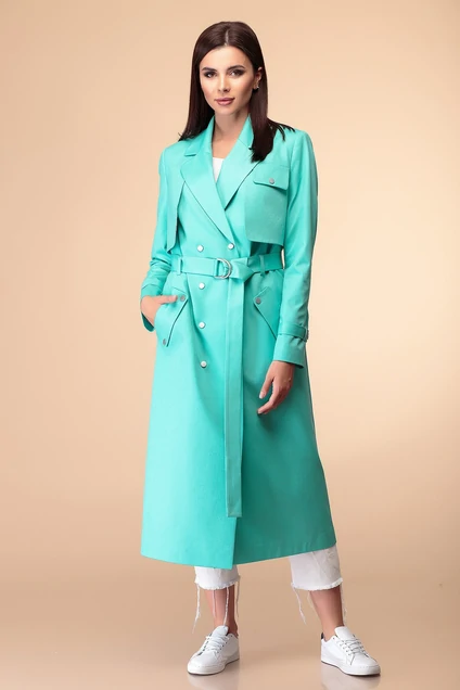 Плащ женский предназначен для повседеневной носки. Плащ женский прямого силуэта, длиной до середины икры. Перед с двумя нагрудными вытачками с двумя отлетными кокетками, на левой настрочной клапан с закругленными концами, декорированными одной металлической кнопкой, с двумя прорезными карманами на уровне линии бедер с листочками с настрочными концами с цельнокроенными клапанами с закругленными концами, фиксирующимися к переду металлическими кнопками. Спинка со средним швом, заканчивающимся шлицей, с отлетной кокеткой. Горловина с V-образным вырезом с отложным лацканом и воротникам пиджачного типа с закругленными концами. Застежка центральная двух борная на 8-мь пробивных металлических кнопок. Рукав втачной, длинный, двух шовный внизу с патой, фиксирующейся к рукаву на одну металлическую кнопку(вторая декоративная). Плащ на подкладке. Плащ с плечевыми накладками. Плащ со съемным поясом, фиксирующийся на уровне линии талии в пять настрочных шлевок и на металлическую пряжку. Длина спинки 117см. Длина рукава 60см.