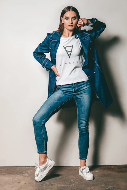 Плащ джинс, приталенного силуэта, на поясе. Имеет воротник -лацканы, втачной длинный рукав на патах, отлетная кокетка на полочке. Двубортная застежка на петли и декоративные серебристые пуговицы. Карман листочка. По спинке шлица. Отстрочка декоративной строчкой белого цвета.