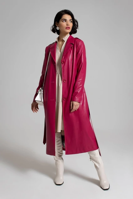 Плащ полуприлегающего силуэта, на подкладке, длиной до середины икры, с втачными рукавами. Плащ с поясом и однобортной застежкой на пуговицах. Спинка с центральным швом и кокеткой. Перед с погонами на плечах на петли и пуговицы. По переду обработаны прорезные карманы с листочкой. Воротник пиджачного типа с лацканами. Рукава двушовные, втачные, длинные. Шлевки для пояса пришиты в боковых швах.