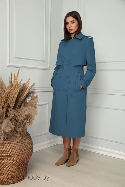Плащ женский прямого силуэта с центральной двубортной застежкой на петли и пуговицы, на подкладке. Перед с отлетными кокетками. По переду обработаны карманы с листочками. Спинка со средним швом и отлетной кокеткой. Рукава двухшовные  втачные. По низу рукавов расположены паты с петлей и пуговицей , протянутые в шлевки. Воротник пиджачного типа. По линии талии расположены широкие шлевки, в которые протянут ремень с пряжкой. На плечевых швах обработаны паты со шлевкой, застегивающиеся на петлю и пуговицу.