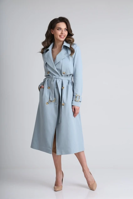 Плащ женский из джинсовой ткани прямого силуэта с центральной двубортной застежкой на петли и пуговицы, на подкладке. Перед с отлетными кокетками. По переду обработаны карманы с листочками. Спинка со средним швом и отлетной кокеткой. Рукава двухшовные втачные. По низу рукавов расположены паты с петлей и пуговицей , протянутые в шлевки. Воротник пиджачного типа. По линии талии расположены широкие шлевки, в которые протянут ремень с пряжкой. На плечевых швах обработаны паты со шлевкой, застегивающиеся на петлю и пуговицу. Длина по среднему шву спинки- 116см. Длина рукава-64см.