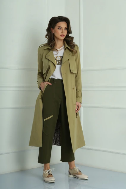 Плащ женский из джинсовой ткани прямого силуэта с центральной двубортной застежкой на петли и пуговицы, на подкладке. Перед с отлетными кокетками. По переду обработаны карманы с листочками. Спинка со средним швом и отлетной кокеткой. Рукава двухшовные втачные. По низу рукавов расположены паты с петлей и пуговицей , протянутые в шлевки. Воротник пиджачного типа. По линии талии расположены широкие шлевки, в которые протянут ремень с пряжкой. На плечевых швах обработаны паты со шлевкой, застегивающиеся на петлю и пуговицу. Длина по среднему шву спинки- 116см. Длина рукава- 64см.