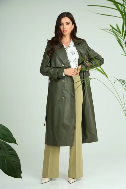 Плащ женский из экокожи прямого силуэта с центральной двубортной застежкой на петли и пуговицы, на подкладке. Перед с отлетными кокетками. По переду обработаны карманы с листочками. Спинка со средним швом и отлетной кокеткой. Рукава двухшовные втачные. По низу рукавов расположены паты с петлей и пуговицей , протянутые в шлевки. Воротник пиджачного типа. По линии талии расположены широкие шлевки, в которые протянут ремень с пряжкой. На плечевых швах обработаны паты со шлевкой, застегивающиеся на петлю и пуговицу. Длина по среднему шву спинки- 116см. Длина рукава- 64см.